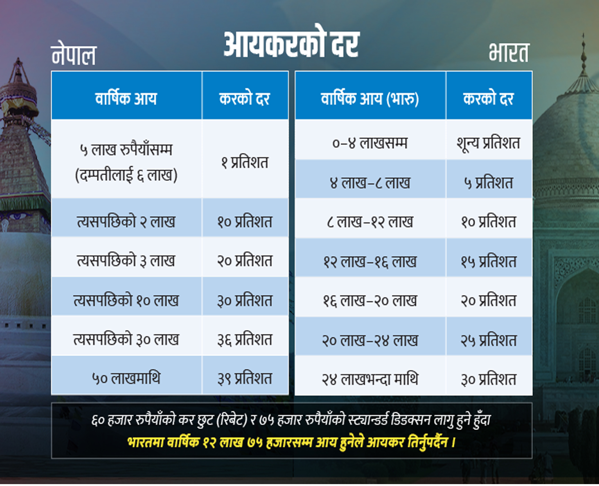 तर, ६० हजार रुपैयाँको कर छुट र ७५ हजार रुपैयाँको स्ट्यान्डर्ड डिडक्सनको नियमका कारण १२ लाख ७५ हजार भारुसम्म आय हुने भारतीयले आयकर तिर्नुपर्दैन । त्यो भनेको २० लाख रुपैयाँ हुन्छ । तर, त्यति नै आम्दानी गर्ने नेपालीले चार स्ल्याबमा ३० प्रतिशतसम्म कर तिर्नुपर्ने हुन्छ । भारतमा आयकर स्ल्याब परिवर्तन हुँदा नेपालमा पनि गर्ने परम्परा केही वर्षदेखि नेपाल सरकारले तोडेको छ । त्यसो हुँदा यसपटक पनि भारतको आयकर स्ल्याबमा मिल्दोजुल्दो हुने गरी करका दरमा परिमार्जनको सम्भावना कम भएको अर्थ मन्त्रालय स्रोतले जनाएको छ ।