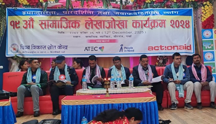 वीरगंज,२६ मंसिर । दिब्य विकास स्रोत केन्द्र पर्साले आफ्नो वार्षिक कार्यक्रम अन्तर्गत १९औँ सामाजिक लेखाजोखा कार्यक्रम वीरगंजस्थित कलासिक ब्याङ्क्वेटमा सम्पन्न गरेको छ। कार्यक्रममा जिल्ला समन्वय समिति पर्साका उपप्रमुख पुरन पटेल प्रमुख अतिथिको रूपमा तथा केन्द्रका अध्यक्ष उमेश प्रसाद चौहान अध्यक्षका रूपमा सहभागी थिए।