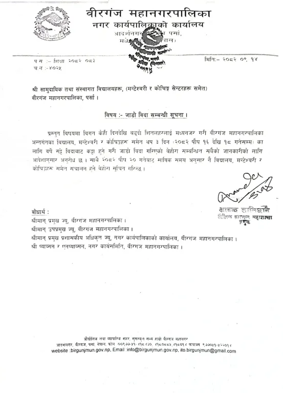 वीरगंज,१५ पुस । विगत केही दिनदेखि बढ्दो अत्यधिक चिसो र शीतलहरको प्रभावलाई मध्यनजर गर्दै वीरगंज महानगरपालिकाले आफ्नो मातहतका विद्यालय, मन्टेश्वरी र कोचिङ सेन्टरहरूमा थप ३ दिन बिदा दिने निर्णय गरेको छ।