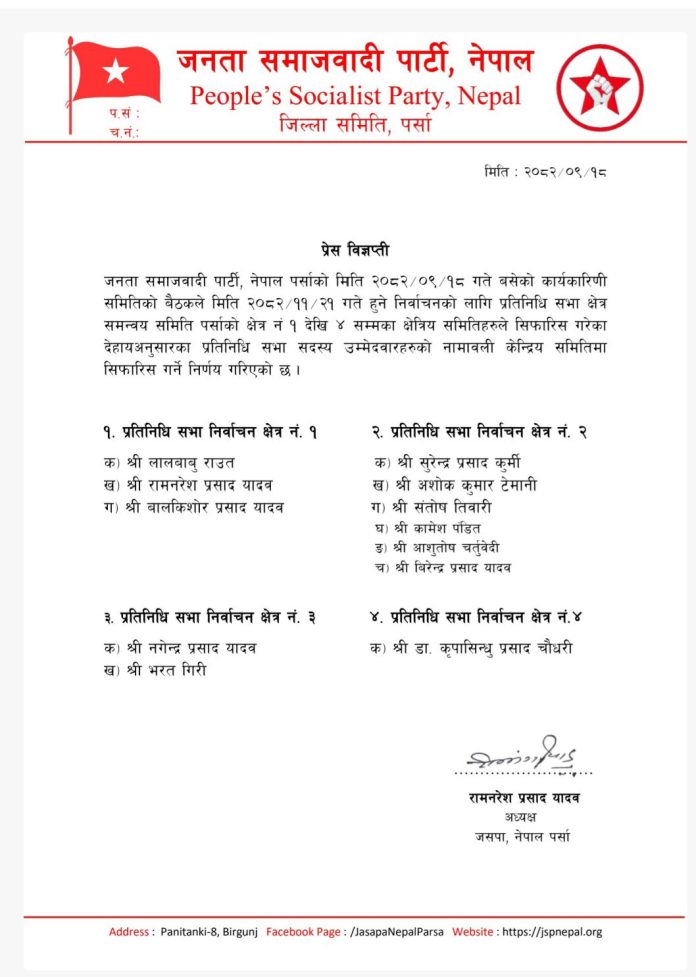 वीरगंज,१८ पुस । जनता समाजवादी पार्टी (जसपा) नेपाल, पर्साले आगामी फागुन २१ गते हुने प्रतिनिधि सभा निर्वाचनका लागि जिल्लाका चारै निर्वाचन क्षेत्रबाट उम्मेदवारको नाम सिफारिस गरेको छ।